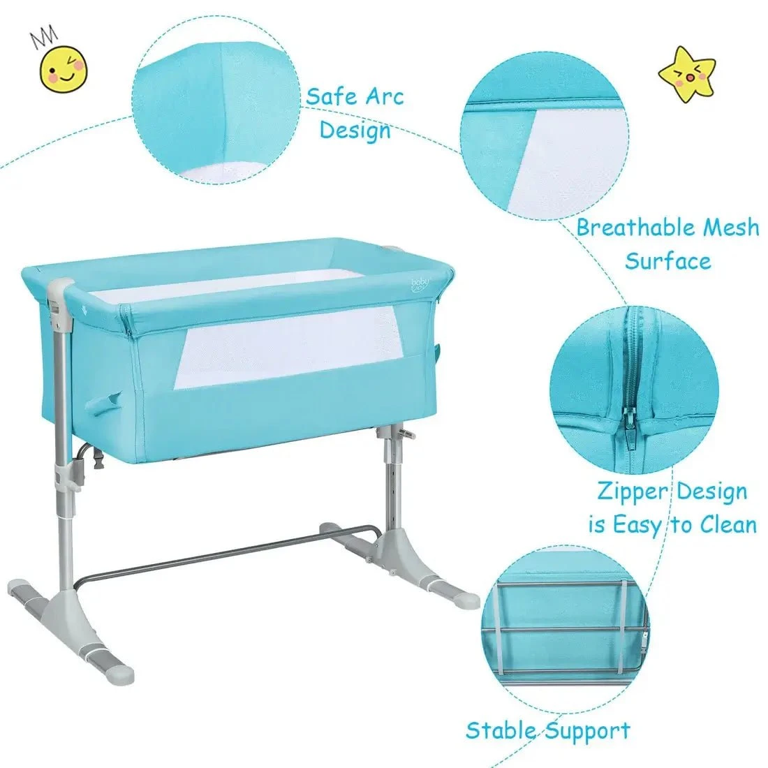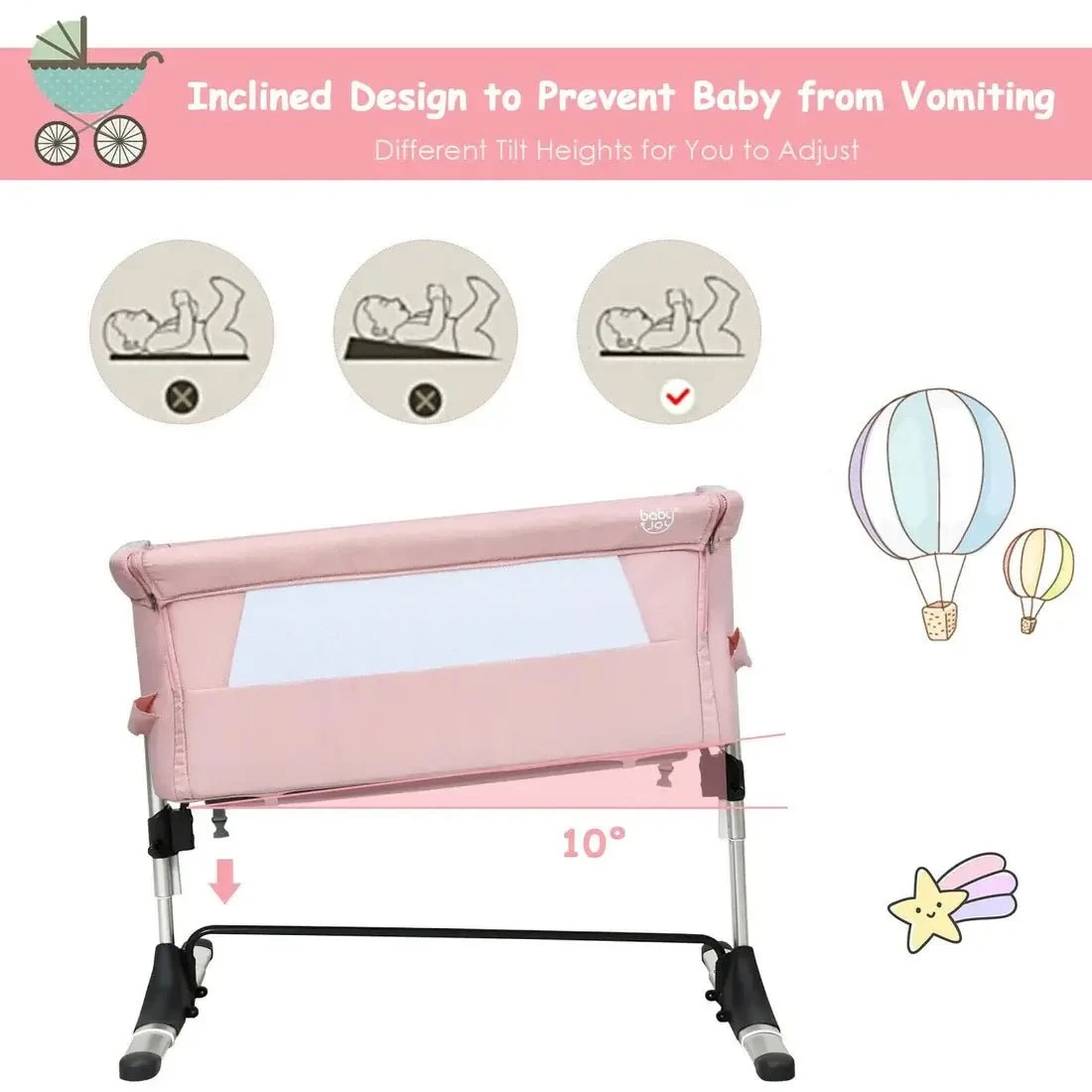 Adjustable in height and angle : There are four heights that may be adjusted to fulfill the various needs of parents. Also, the lengths of the two sides can differ from each other. Because the tilt angle effectively prevents the infant from Outflow and spitting milk, Our Portable Bed Side Bassinet makes it easier for you to feed your baby.