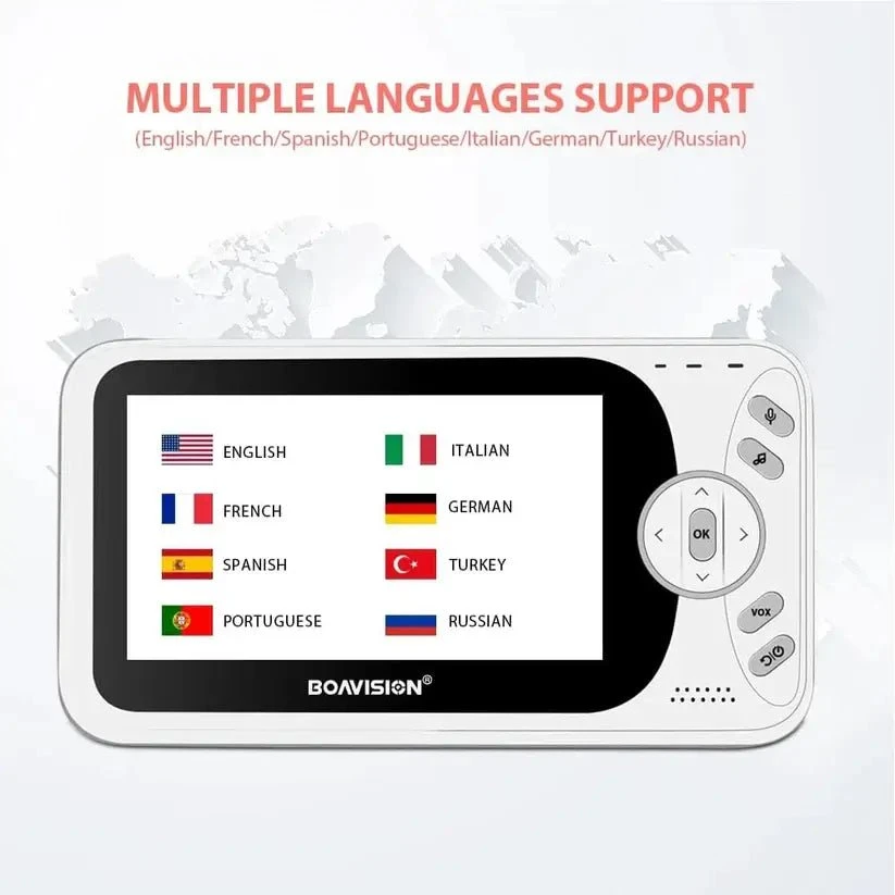 Built-In 8 Lullabies – Built-in lullabies in baby monitor may help the parents comfort the baby fall into sleep. 2 peaceful melodies and 2 sets of background noise, gently soothe your infant to sleep. This system offers two-way talkback, enabling your baby to hear your voice wherever you want. Multiple Languages Support – This baby Monitor functions in many languages, below are as mentioned. English / French / Spanish / Portuguese / Italian / German / Turkey / Russian.