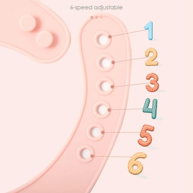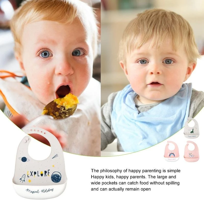 Cute Baby Silicon Bibs feature rounded, built-in neck fasteners for a snug and comfy fit. Deep front pocket is perfect for catching food, keeping your baby and surrounding area clean.