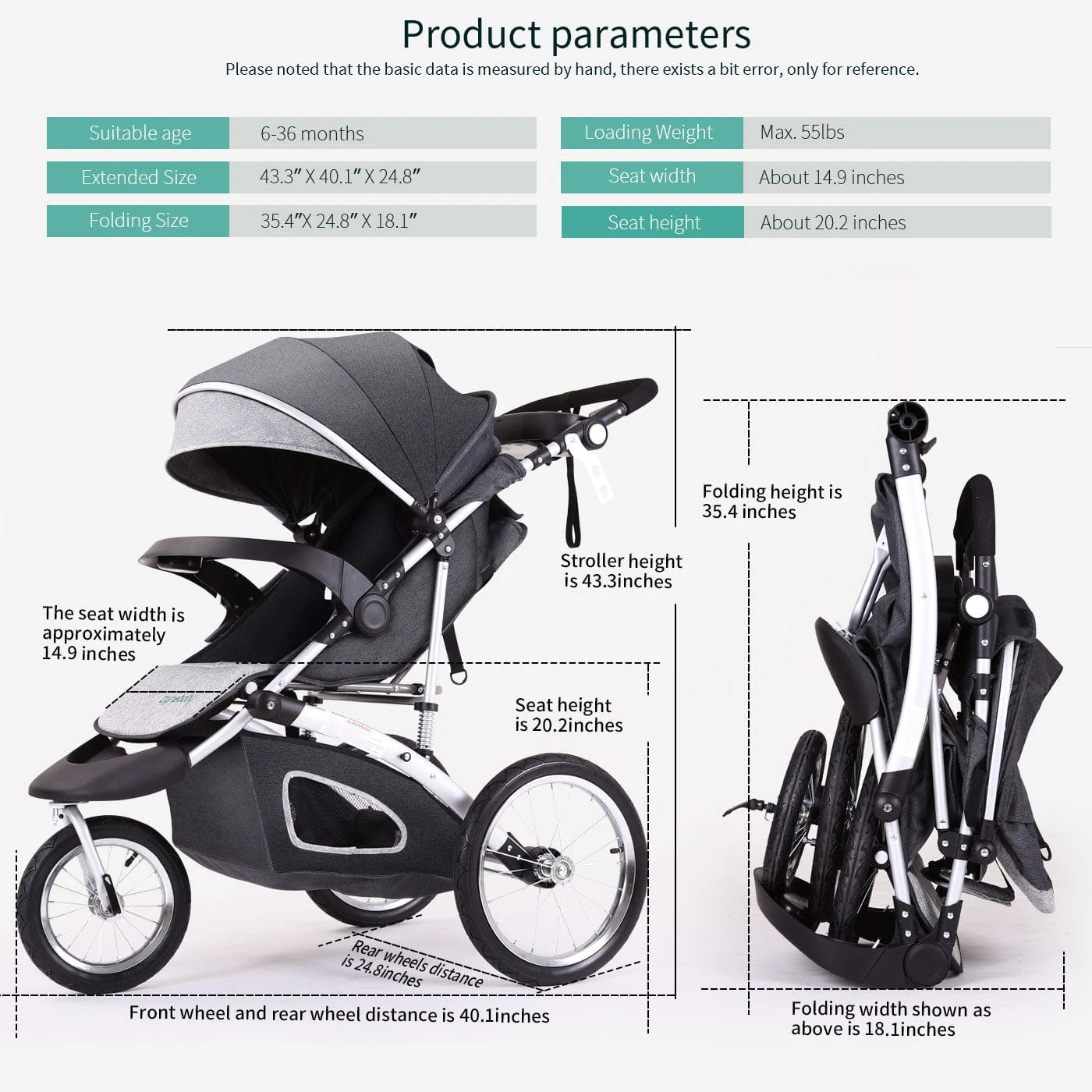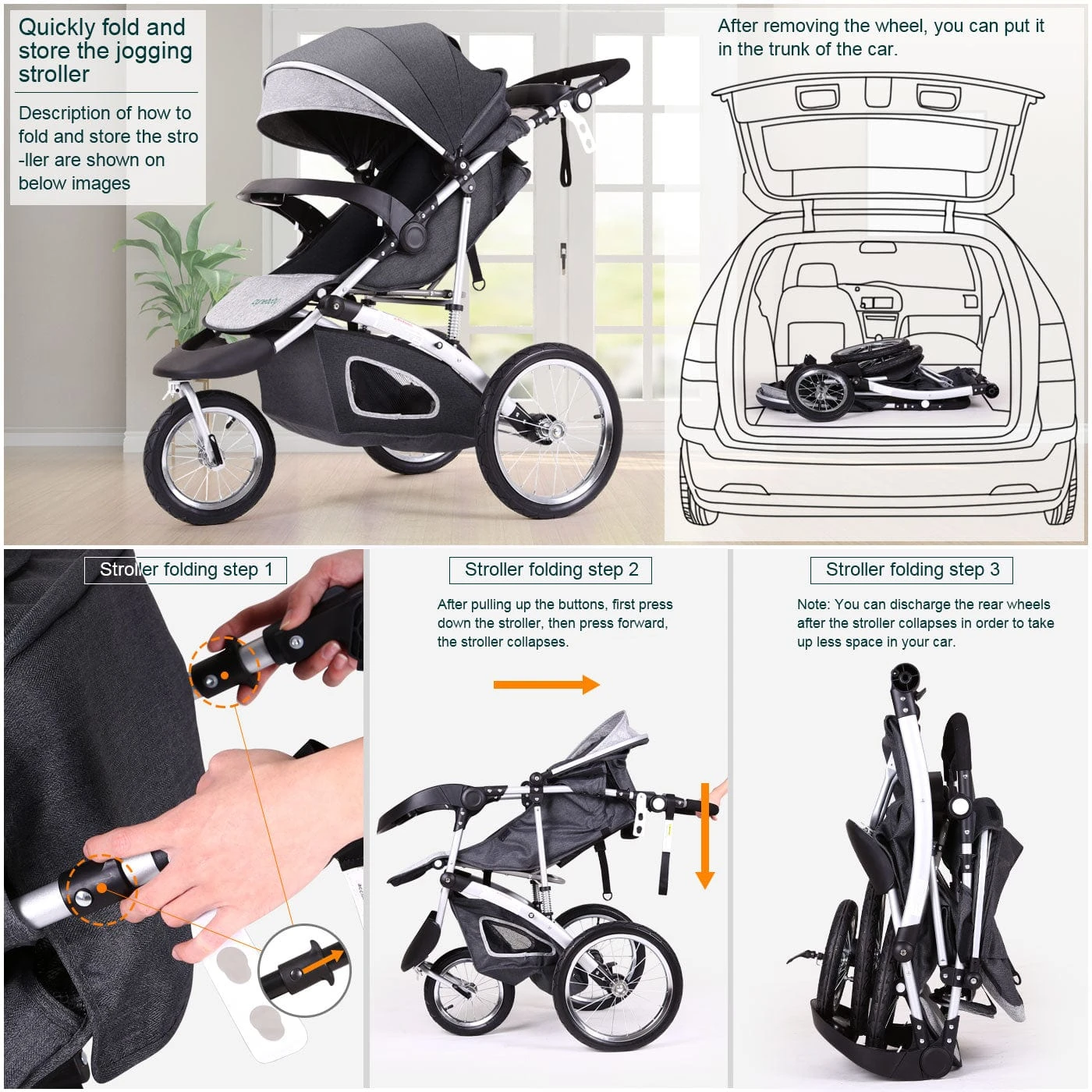 Make it Compact in Seconds: Our Fun&Run® Jogging Baby Stroller requires less than 10 seconds to fold… Just need to click the pull the summary then push it a little down and it is done… you can see the pictures for better understanding