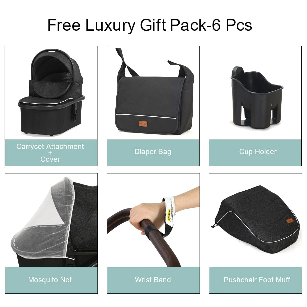 - Service and Package Includes: We offer 15 days of 100% money back if you are not satisfied with the baby stroller. For any after-sale or maintenance, please feel free to contact us we will reply within 24 hours. Every stroller is equipped with a carrycot attachment cover, diaper bag, warm foot cover, cup holder, safe stroller wrist strap, soft baby seat cushion, pushchair foot muff, and mosquito net.