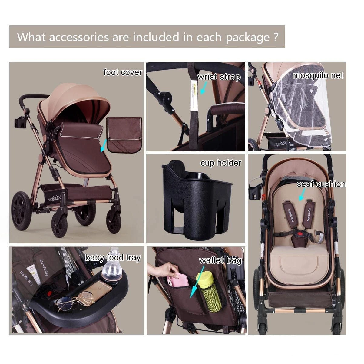 - Package Includes: Every stroller is equipped with stroller accessories like stroller food tray, warm foot cover, cup holder, safe stroller wrist strap, baby seat cushion, and mosquito net.