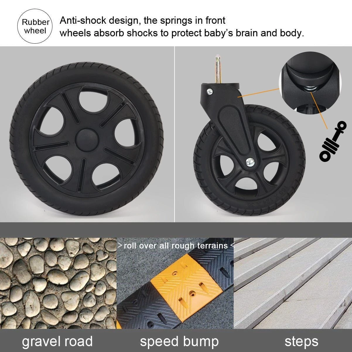 - Unique Safety Design: Your baby’s safety is of utmost importance. To guarantee it, you need to pay attention to every single detail. Our stroller has anti-shock springs installed in the front wheels, ensuring that your baby remains safe and comfortable even when you’re strolling on rocky terrain. With our stroller, you can rest assured that your baby is getting the best protection.