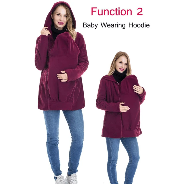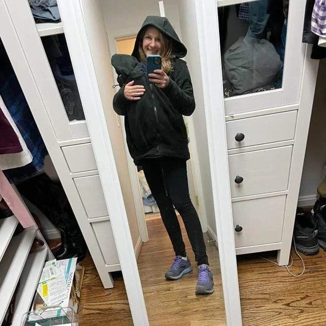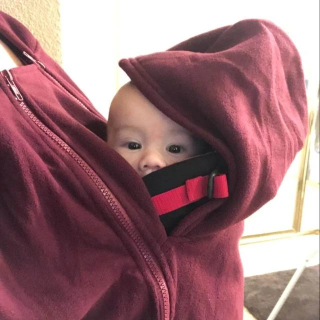 “This jacket is perfect! Very thick fleece and what I wanted for the winter. I live in a very cold area and have to walk my dogs with baby in the carrier so I wanted something that could go over him as well. The little hood part is perfect for him and is big enough that there is room for him to grow into it. I usually carry him in a wrap but have tried it with another carrier and it works great with both. I am 5’2 and 150 lbs, the large is a perfect fit with enough room to wear a heavy sweater under. I wear this jacket without the insert as well when I’m not wearing baby. I already get so much use out of it and am so happy. The jacket is heavy enough that I can wear on cold days but if it goes below 35-40 I usually wear another winter coat over top. It is long enough to cover babies feet in the carrier as well.”