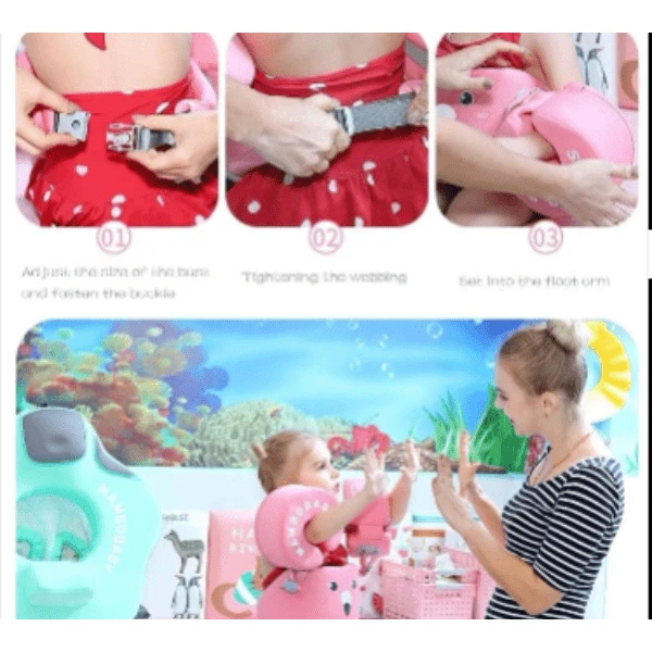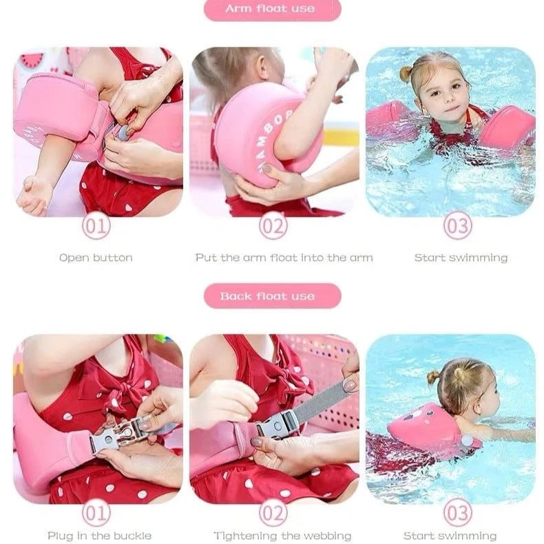 The Baby Swim Float is really easy to wear and strap on baby as shown below. Just need to put baby’s chest in the float and strap it. Then baby need to put hands in baby float MamboBaby™ Baby/Toddler Arm Float and strap the wings. Tada… baby is wearing it to enjoy water and splash water on you.🤗