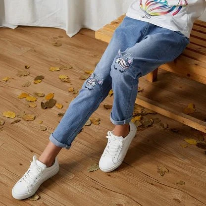 Cute Cat Design: These jeans feature an adorable cat design that will make your little girl look stylish and cute. Perfect for any occasion, the cute cat appliques add a fun and playful touch to these fashionable jeans.
